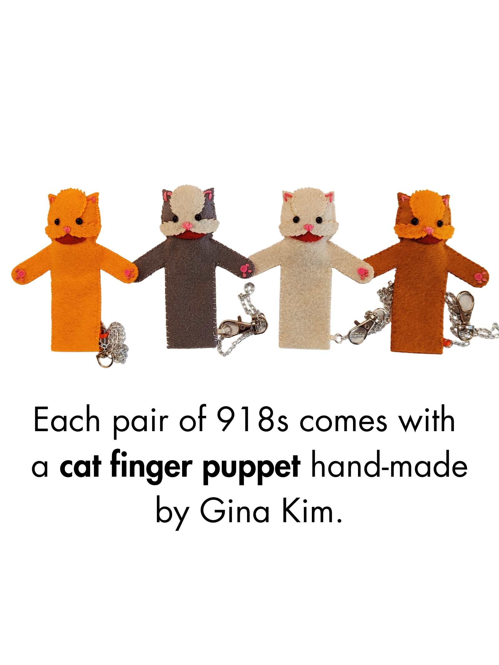 Each pair of 918's come with a cat finger puppet hand made by Gina Kim. The design is inspired by our tailor Terry's cats. He has a lot of cats so the puppets come in a variety of styles. Your puppet will be randomly picked by David!