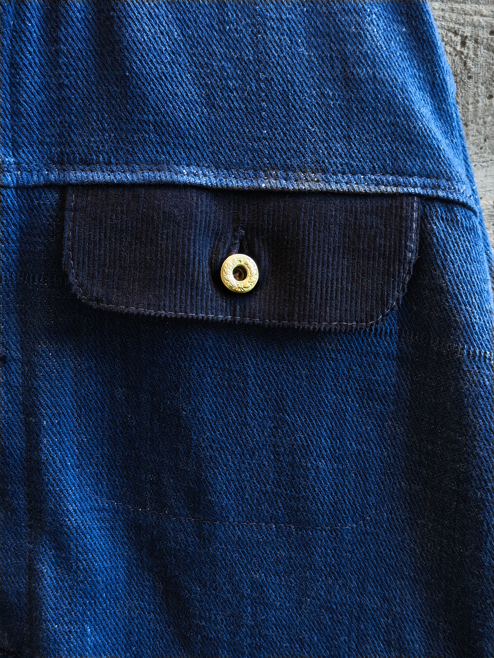 - The collar and pocket flaps are cut from rich navy blue corduroy.